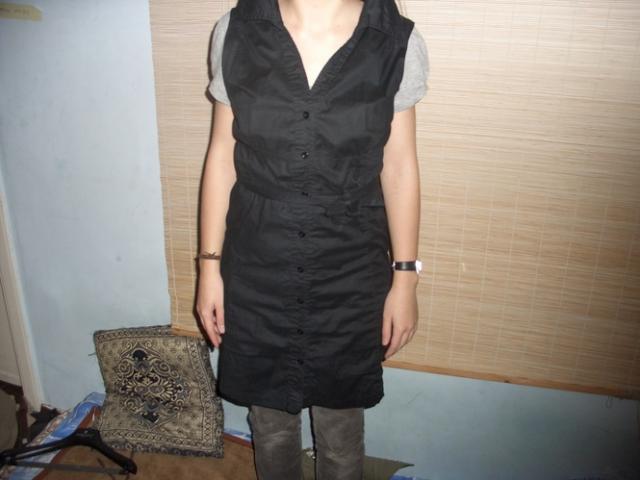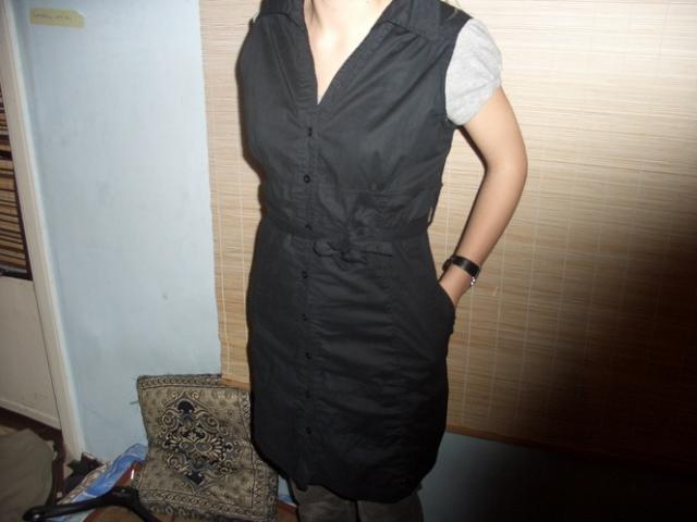 Dydis M. Įsiuvimas pabrėžia krūtinę. Su fainom kišenėlėm.Sodriai juodas, blogos nuotraukos tiesiog. Diželį galima rištis paprastai, ten tik aš tokią gėlę raitau :)