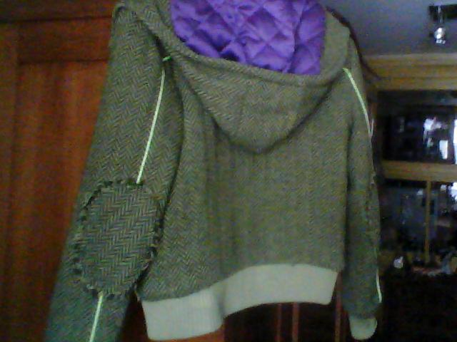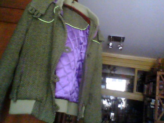 Originalus storos tvido tipo medžiagos striukė-paltukas su nusegamu gobtuvu. Dėvėtas sezoną, bet būklė labai gera, jokių defektų. Spalvos foto neadekvačios - realiai jis ryškiai samaninis su pilkšvais, o atlasinis daigstytas pamušalas - violetinis. Pašiltintas. Puoštas "fosforinėmis" (atšviečia šviesą) juostelėmis. Dydis S.