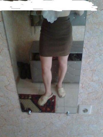 Trumpas, isryskinantis klubus linija sijonas. Rudos spalvos. Tinka plonai merginai, apie 160 cm ugio.