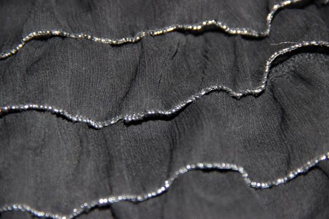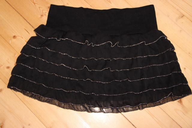 Vieną kartą dėvėtas sijonas (sceniniam pasirodymui). Pasloksniuotas, kiekviena klostė apsiuta vos blizgančiais siūlais. Etiketė nukirpta (ta, kur surašyta sudėtis, plovimo sąlygos ir pan.) 30cm ilgio. + p.i.
