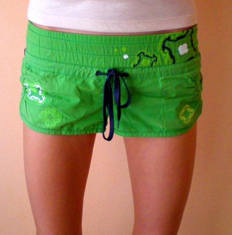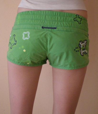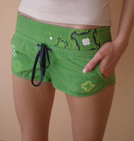 Trumpi šortukai, XXS-XS dydžio. Spalva realiai tokia kaip 2 ir 3 nuotraukose, susiriša priekyje raišteliais. Be defektų. NEMAINAU.