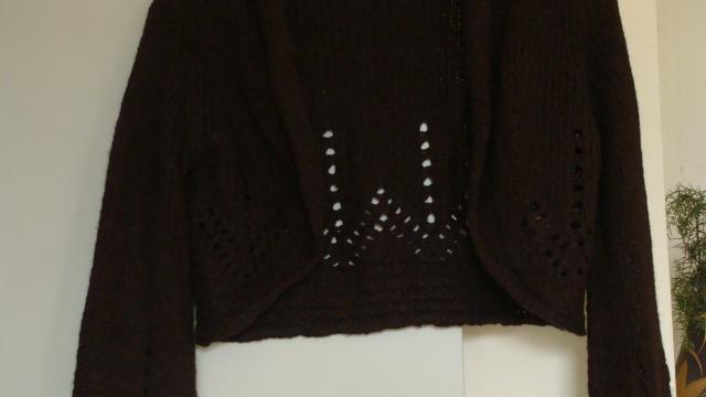 tamsiai rudas, trumpas megztinis be užsegimo ilgom platėjančiom rankovėm, mažai nešiotas, puikios kokybės :) dydis neparašytas bet manau S