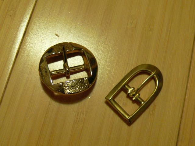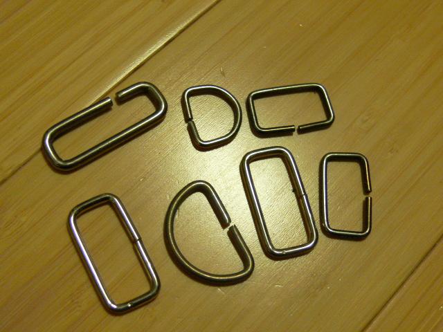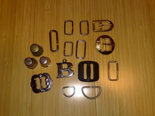 įvairios metalinės kilpos (2-3 cm dydžio), 2 diržų sagtelės (diržo plotis 2 cm apvaliai sagčiai ir 1,3 cm - pailgai); 2 sagtelės (juoda plastmasinė - 2,2 cm pločio juostelei ir metalinė 1,5 cm pločio juostelei) (c)