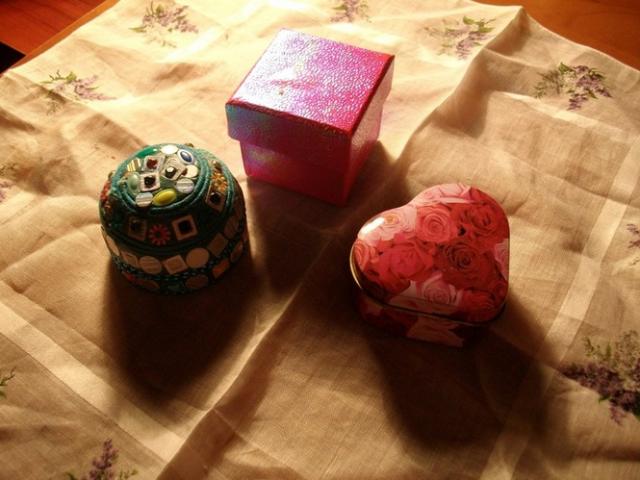 trys mažos dėželės, dvi metalinės, o toji blizganti rožinė iš slidaus tokio kartono :)
