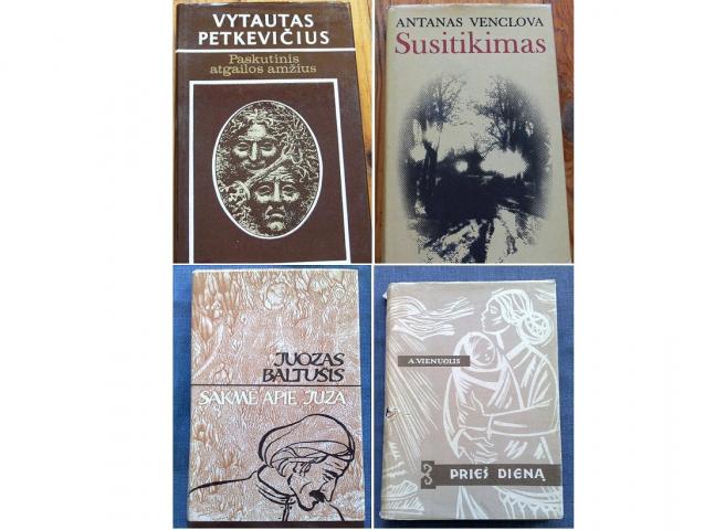 J.Baltušis "Sakmė apie Juzą" - geriausias autoriaus kūrinys, 1984 m, 278 psl. A.Vienuolio romanas "Prieš dieną" - 1964 m, 258 psl. A.Venclova "Susitikimas" - apsakymų rinkinys, 1987m, 526 psl. Kaina - po 2 eur V.Petkevičius "Paskutinis atgailos amžius" - NEBĖRA