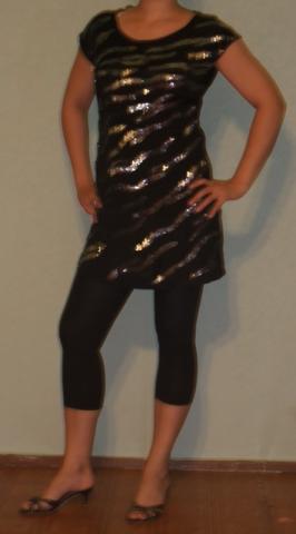 Siuvineta žvyneliais juoda tunika gražiai atrodanti ant timpiu.Žemesniai merginai galetu buti suknele fotografuota ant 176 cm. Dydis 38 -40