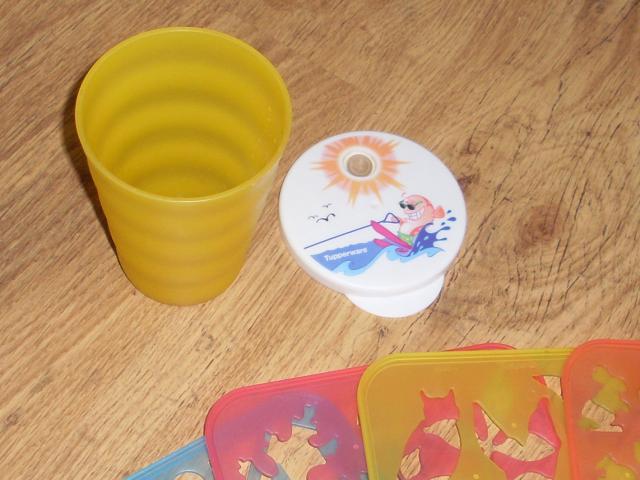 tupperware firmos. vaikams. sandarus puodelis, yra spec. vieta siaudeliui ikisti. labai pravercia vasara- laikant gerima lauke, kai vaikas zaidzia- neprilys jokiu vabalu, neisilaistys. nekenksmingos plastmases. Trafaretai dar;)