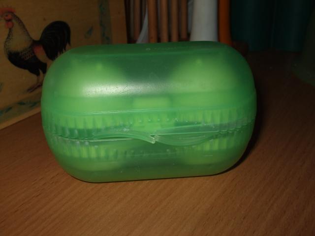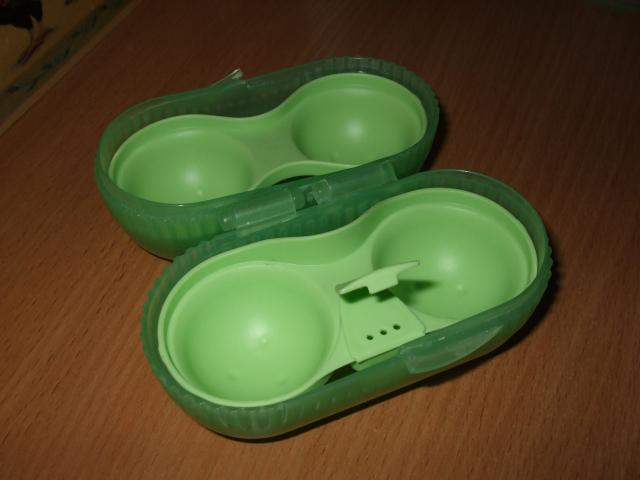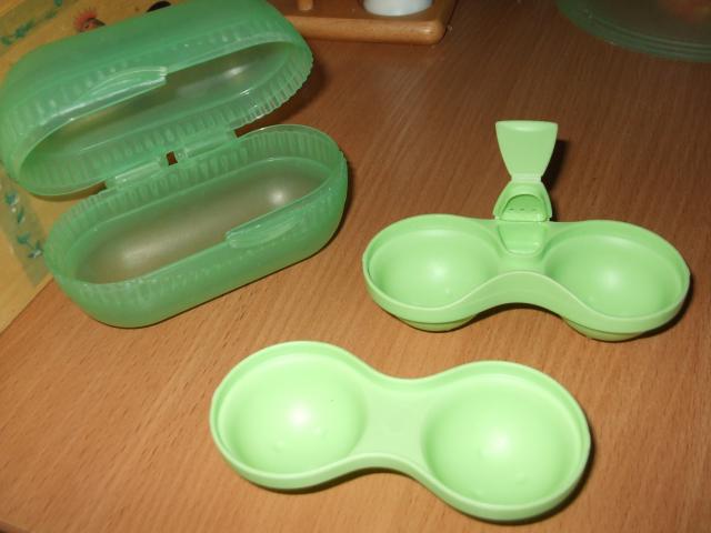 Tupperware užkandžių dėžutė. Yra įdėkliukas dviems kiaušiniams ir skyrelis druskai