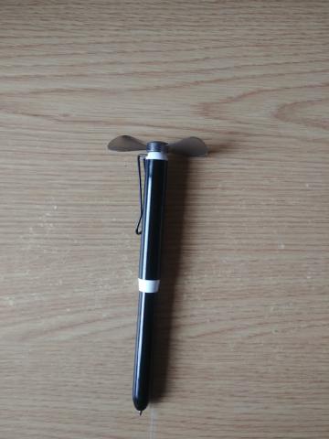 Metalinis tušinukas su ventiliatoriumi, metalinis, sunkus, veikiantis. Viduje dedasi AAA baterija.
