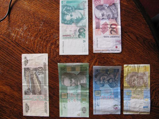 Ukrainos grivinos, 20 Kroatijos kunų, 20 Vokietijos markių, 10 Rusijos rublių