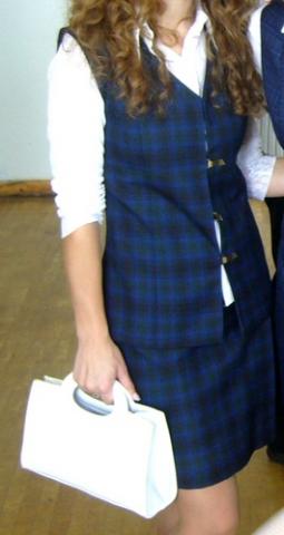 Mėlynas, languotas. Liemenė ir sijonas. S - M dydis.