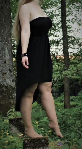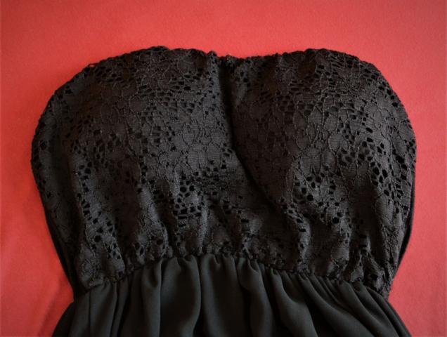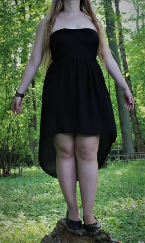 Parduodama juoda suknelė be petnešėlių. Yra tvirta tampri guma, gerai laikosi. Krūtinės vietoje yra pakietinimai. Tinka dydžiams nuo S iki L, nes viršutinė dalis labai tampri. Ilgis priekyje - 65 cm; Ilgis gale - 101,5 cm; Krūtinė - 32 cm, tempiasi maždaug iki 45-47 cm; Liemuo - 26,5 cm, tempiasi maždaug iki 40 cm; Klubai ties pamušalu 46 cm, truputį tempiasi. Viršutinė sijono dalis laisvai krenta.