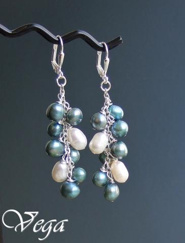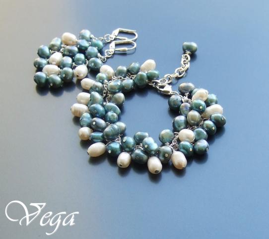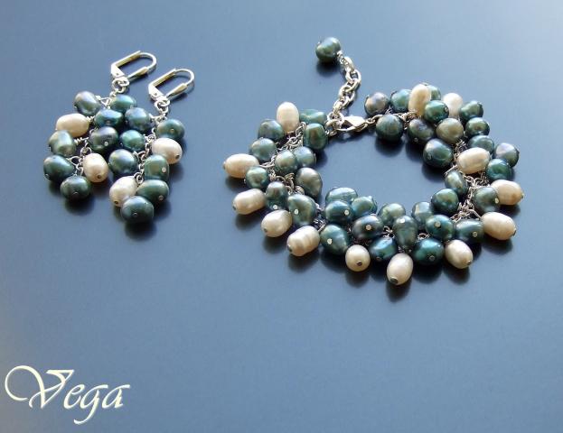 Upiniai perlai balti ir pilkšvai melsvi, sidabro spalvos metalas