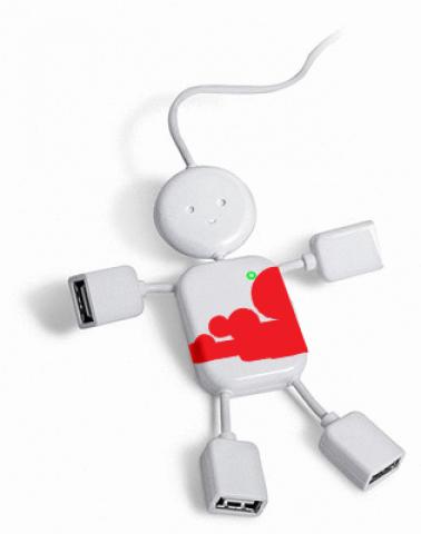Baltas žmogeliuko formos USB skirstytuvas su “Ežio” logo, turi 4 USB išėjimus, į kuriuos galima pajungti 2.0 greitį palaikančius USB įrenginius.