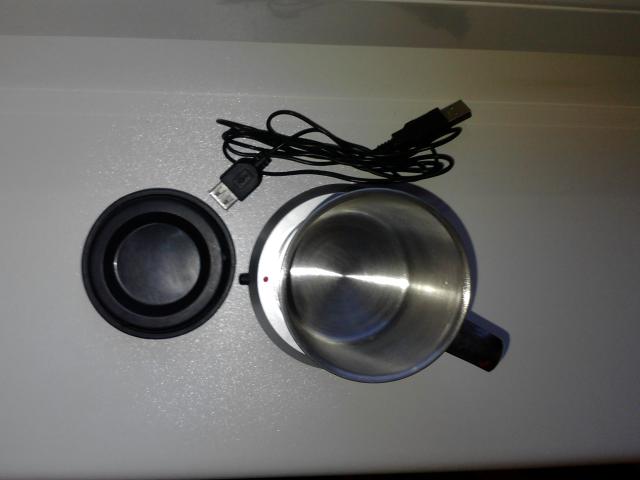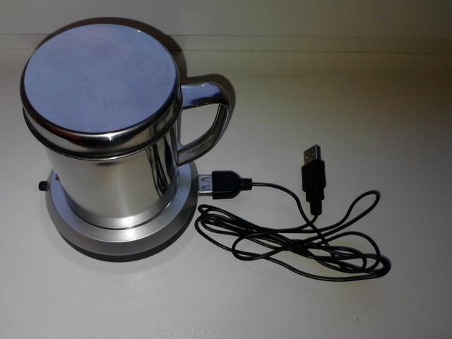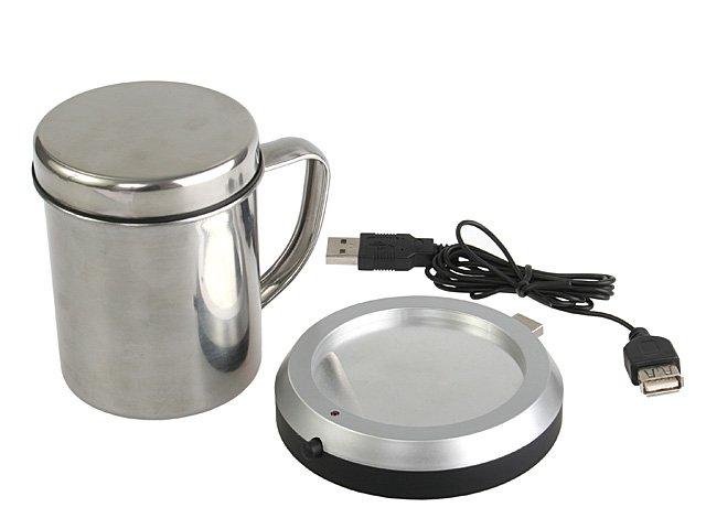 USB puodelio šildytuvas, palaikantis skysčio temperatūrą. Su nerudyjančio plieno puodeliu. Nenaudotas. Nuoroda: http://usb.brando.com/prod_detail.php?prod_id=00322