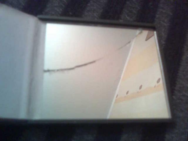 maža knygelė su besikeičiančiu paveikslėliu. Įskilęs veidrodėlis, matosi antroj foto