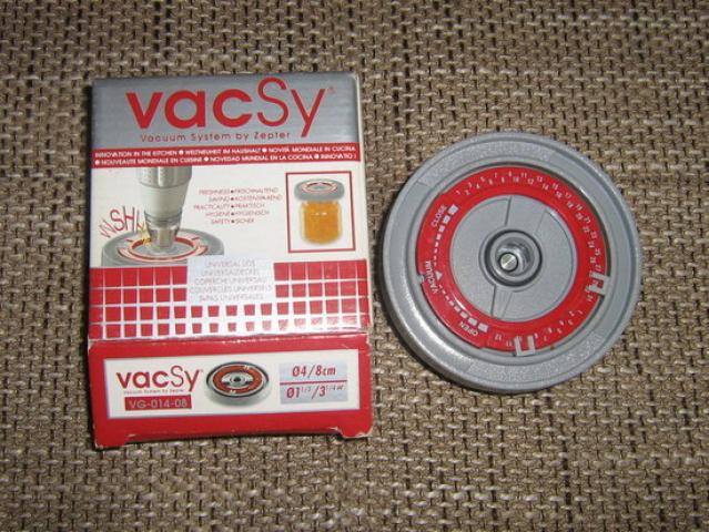 Turintiems Vacsy siurbli. ( maciau , kad kazkas parduoda :), jei neturite). Naujas universalus dangtelis. Dangtelis, skirtas vakuumuoti maisto produktus įvairių išmatavimų induose lygiais kraštais (pvz.: stiklainiuose, stiklinėse, puodeliuose ir t.t. ).Išmatavimai: Ø nuo 4 iki 8 cm Kaina naujo 100lt. http://www.e-zepter.lt/home-art/zepter-vacsy-linija/universalus-dangtelis-diam-4-8-cm.html Nusipirkome labai daug vakuuminiu indu- visu nenaudojam. Si inda net nepabandem.