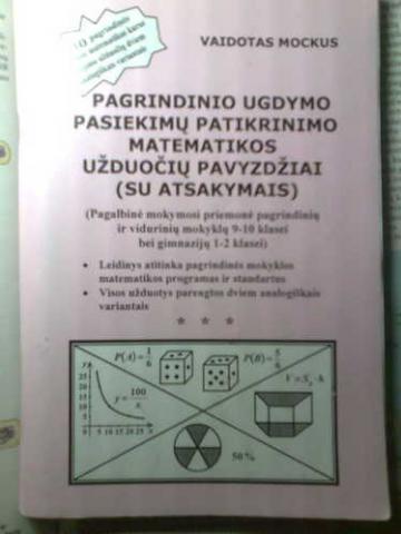 Vaidotas Mockus. "Pagrindinio ugdymo pasiekimų patikrinimo matematikos užduočių pavyzdžiai (su atsakymais)". 2006 Šiauliai. beveik kaip nauja. šalia uždavinių yra prirašytų pastabų pieštuku, bet jas galim ištrint nesunkiai.