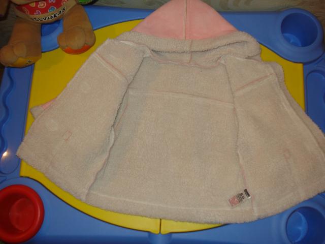 mergaitiška,švelniai rožines spalvos šilta dublionkyte,nedaug nešiota,be defektu,6-9 men.iki 9,5 kg.atiduosiu už 10Lt.+p.i.