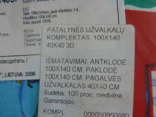 Trijų dalių: paklodė, užvalkaliukas pagalvėlei ir antklodei. Karta skalbta ir islyginta.