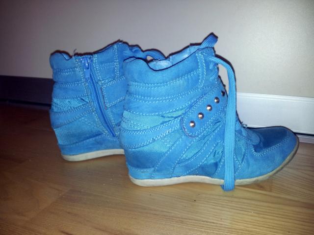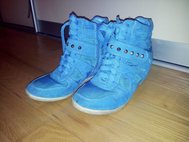 Mėlyni mergaitiški kedukai ant platformytės. Kaip dukra sakė patogūs. Šiek tiek apsitrynę, bet tvirti batai. 32 išmieros pirkti Deichmann.