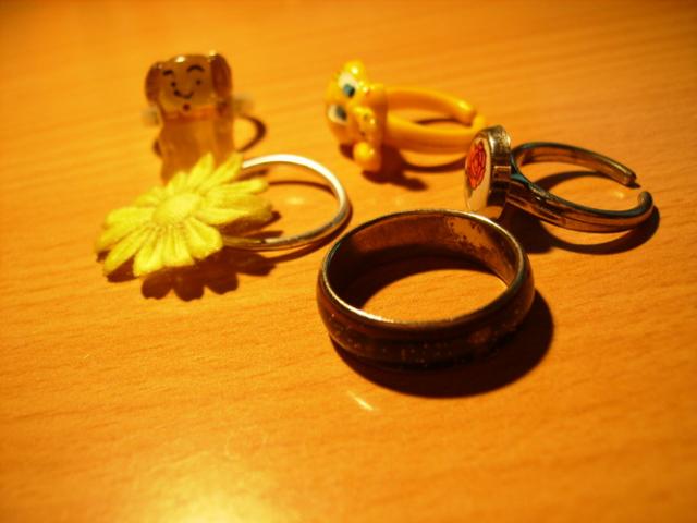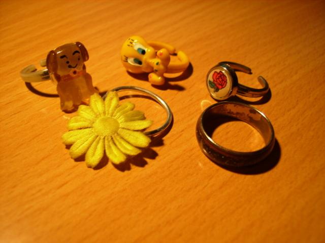 vaikiški žiedai su viščiuku iš filmuko, kažkokiu šuneliu ir visokiom gėlytėm ;Pp aj. dar vienas tai keičia spalvas. ;Dp