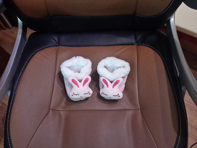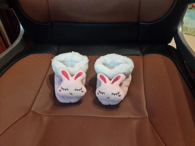 Šlepetės papuoštos mažyčiu pliušiniu gyvūnėliu, kuris linksmins jūsų kūdikį, kai jis judins kojytes. Šlepetės yra universalaus dydžio, tačiau tinka tik kūdikiams iki 12 mėnesių. Naudotos, geros bukles