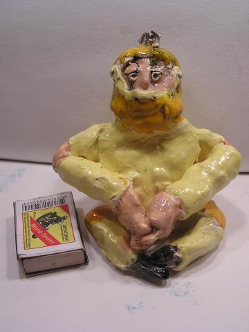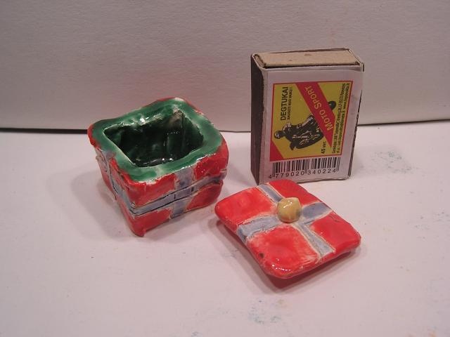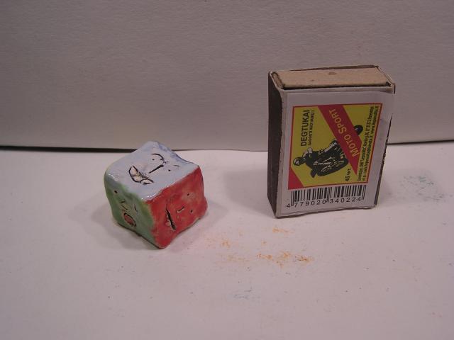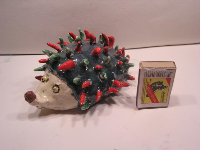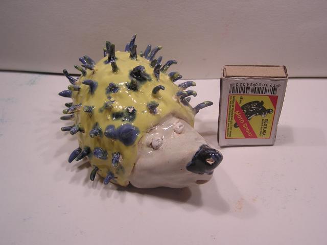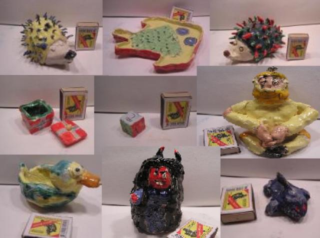 Visi glazūruoti, sąrašas bendroje nuotraukoje iš viršaus į apačią: geltonas ežys, žuvis-lėkštė, mėlynas ežys, dėžutė, kubelis su veidukais, antikos karys, ančiukas-indelis, velnias, ryklys.
