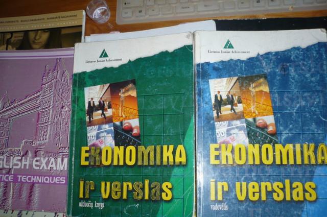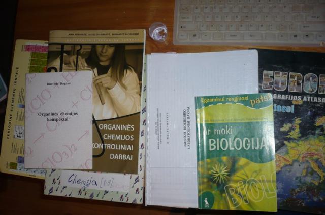 Chemijos (organinės chemijos konspektai, kontroliniai darbai, periodinė lentelė) BIOLOGIJA (ar moki biologiją, jaunojo biochemiko lab. darbai), GEOGR. 8kl. atlasas (nudrožtas toks). EKONOMIKA ir verslas (vadovėlis+pratybos), Anglų k. (enterprice..