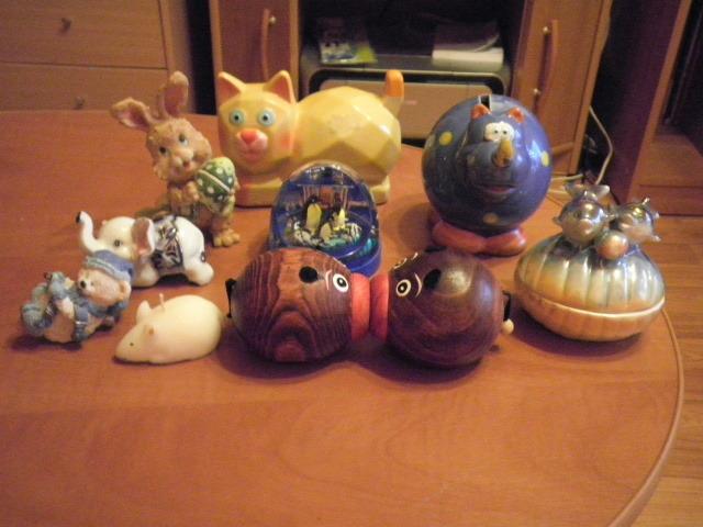 Kol kas- visos yra :) Išmatavimus galėsiu parašyti esant reikalui. Visos statulėlės geros būklės, nes saugiai stovėdavo vienoje vietoje :) P.S tie rudi apvalūs meškiukai- patraukus už siūliuko važiuoja vienas prie kito :)