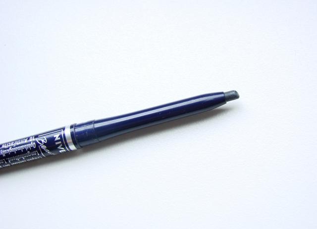 Išsukamas pilkas NIVEA akių pieštukas ir du juodi Maybelline akių pieštukai.