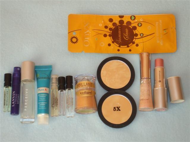 Douglas veidrodėlis, Onyx kremukas po soliariumo su blizgučiais, Garnier mėginėlis nuo spuogų, Lorial blizgis Nr. 301, Essence lūpdažis 50% likę nR. 32, auksinės spalvos šėšėliai, Avon PERCEIVE kvepalai 9ml, kvepalų mėginėliai: Lanvit Sport vyr.,
