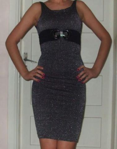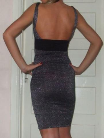 Juoda su sidabriniais blizgučiai, atvira nugara. Įmanoma patrumpinti, išryškina figūrą, truputį laisva per šonus. xs/s. Be diržo. 50 Lt.
