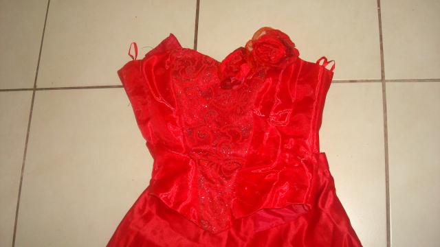 radona, grazi vakarine suknyte. gorsetas, sijonas ir ant sijono dar dedasi toks papustas "antsijonis" :) labai graziai atrodo, parauktas su rozytem, (kaip gorseto). nugaroje varstosi.