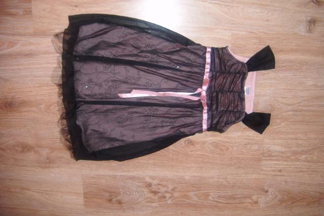 Vakarinė/šventinė juodos spalvos (su rausvu pasijoniu bei kaspinėliu) suknelė iki kelių 11 - 13 m. mergaitei. Dėvėta vos keletą kartų, siųsta iš JAV.
