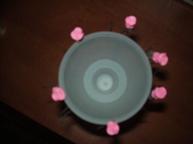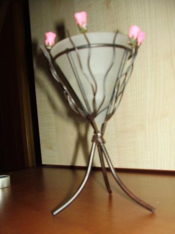 Iš metalo ir matinio stiklo. Galima patalpinti joje mažą žvakutę, su deko roželėmis.