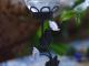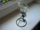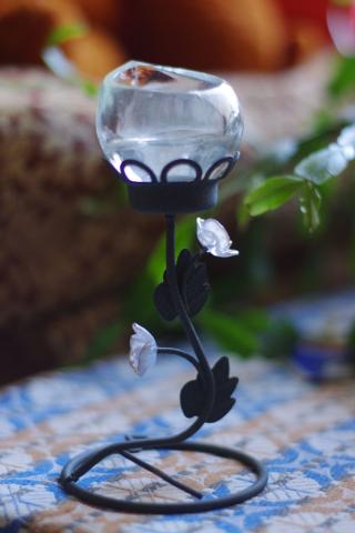 Aukštis 16 cm. Viršus stiklinis, ten įsideda maža arbatinė žvakutė. Šonuose dvi melsvos gėlytės. Yra du vienetai.