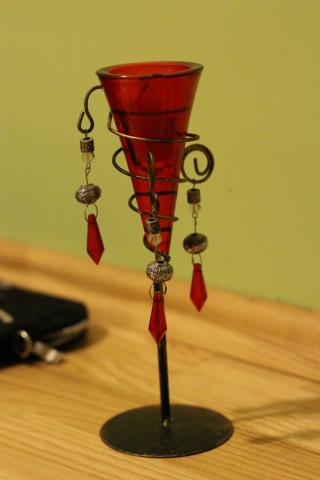 Raudono stiklo, metalinė daili žvakidė :) Naudota, bet niekur nesulūžusi, tik apdulkėjusi.