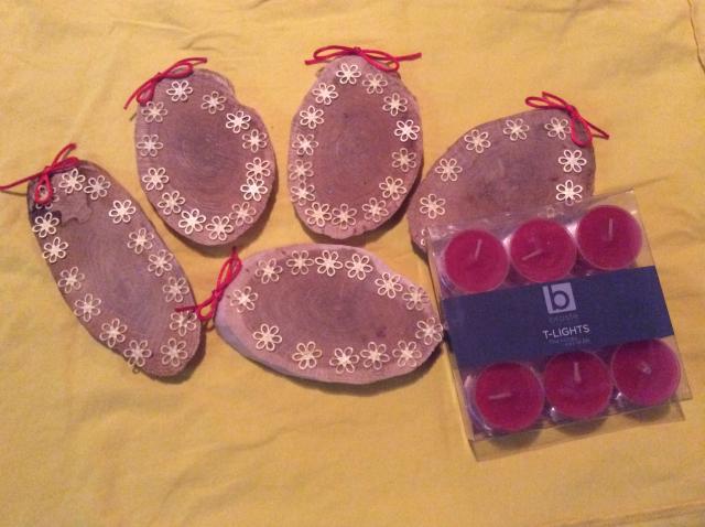 Mediena ir plius žvakės su stikliniais indukais(pirties variantas)ant stalo.Labai gražiai atrodo puošia stala..išbandyta su kitokiu variantu.