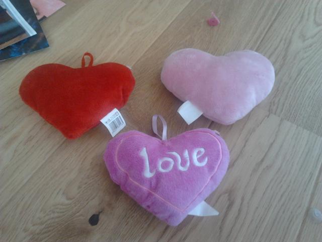 3 minkštos ir švelnios širdelės - viena raudonos, kita - šviesiai rožinės spalvos , trečia - šviesiai violetinės spalvos su užrašu I love you.