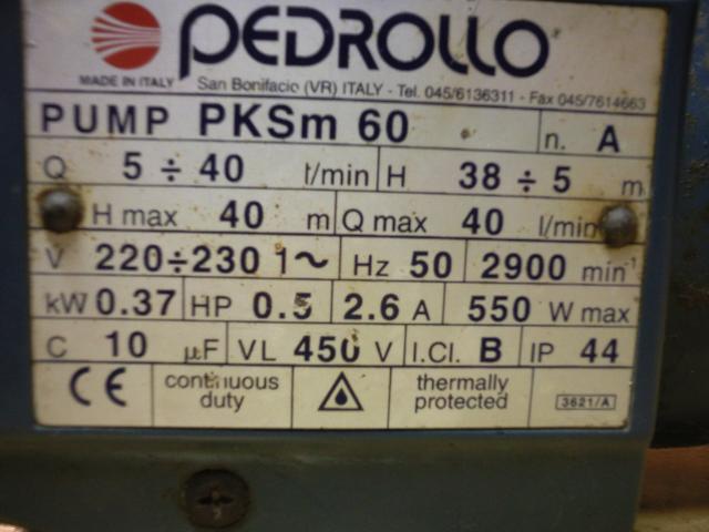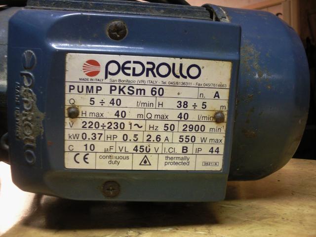 Vandens siurblys PEDROLLO yra veikiantis neblogas siurblys buvo nupirktas galingesnis i vieta o sitas demontuotas. Duomenys ant etiketes matosi. Yra tik nuimant nulauztas vienas tvirtinimo varztelis, kuris liko korpuse. Reikia isgrezti ir padaryti nauja sriegi.
