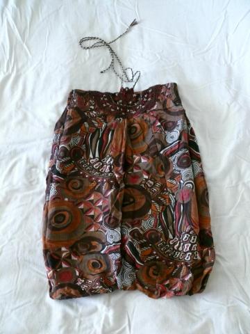 Nauja etnografinių motyvų trumpa dvisluoksnė suknelė yra surišama per kaklą su pinta virvele. Suknelės priekis dekoruotas mezginiu. Prekinis ženklas: Stradivarius Sudėtis: 70 % medvilnė, 30 % viskozė