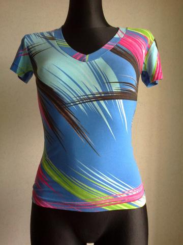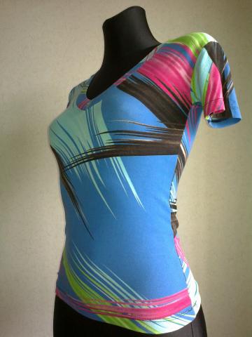 Daili vasarinė maikutė. Tampri medžiaga, tad gali tikti ir M dydį nešiojančioms. Sudėtis 90% viskonas 10% elastanas