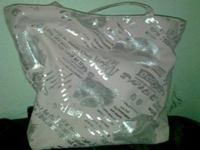 Rožinė, su sidabrinėmis gėlemis ir užrašais pliažinė tašė, didelė, talpi.