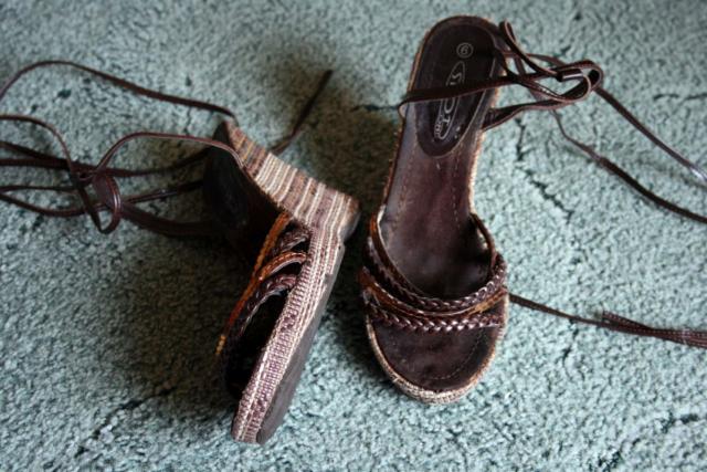 Dėvėtos, rudos, surišamos dirželiais basutės.
