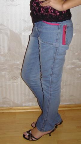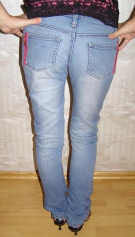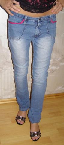 Šviesūs džinsiukai, pažemintu liemeniu, su rausvais pagražinimais. Geriausiai tiktu žemom panelėm (1.60- 1.65cm), XS-dydis