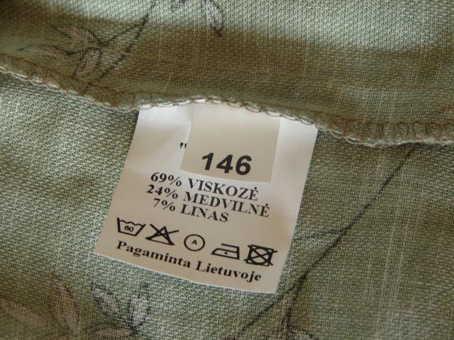 Naujas, bet etikėtė nuplėšta. Gulėjo spintoj. Medvilnė ir linas. Sijonas turi 2 plačias kišenes.Šviesiai samanų spalvos su lauko gėlėm. Lengvas. Puikiai tiktų karštą vasaros dieną pajūrio kurorte. Sijono liemuo ant gumos. Palaidinės priekyje nedidelė klostė. Nelygintas.