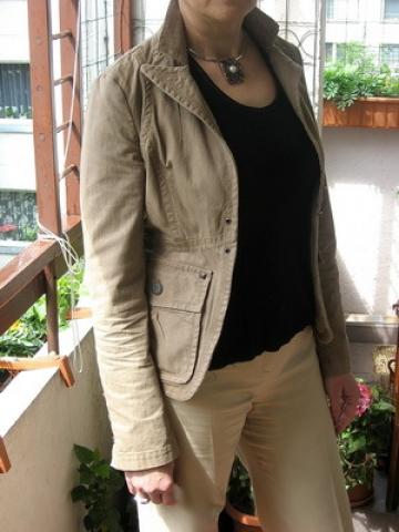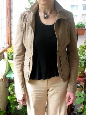 Medžiaga panaši į džinsinę. Be pamušalo. Užsisega kabliukais. Dydis - L (bet greičiau - M)