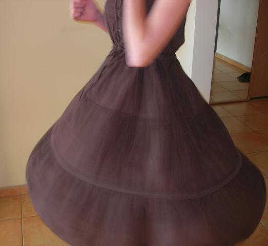 Nuostabi tamsiai ruda suknelė iki kelių, puikiai tinka vasarai.