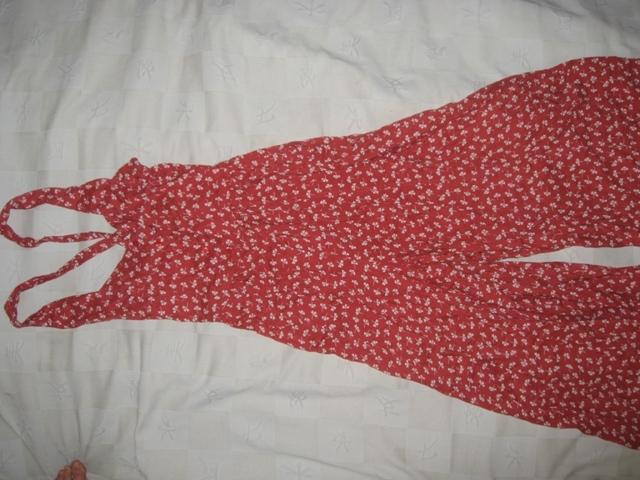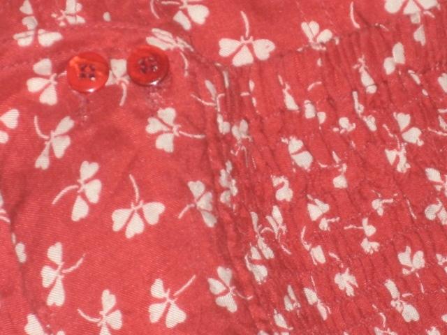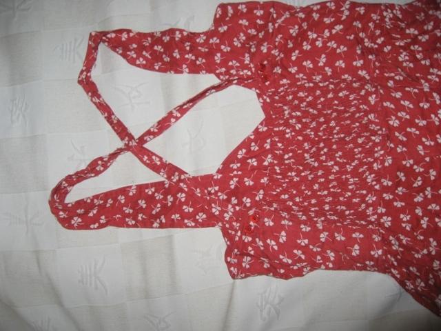 dydis m, bet tiktų ir L, nugaroje yra guma, todėl tamposi, ornamentas - dobiliukai, šviesiai raudonos spalvos